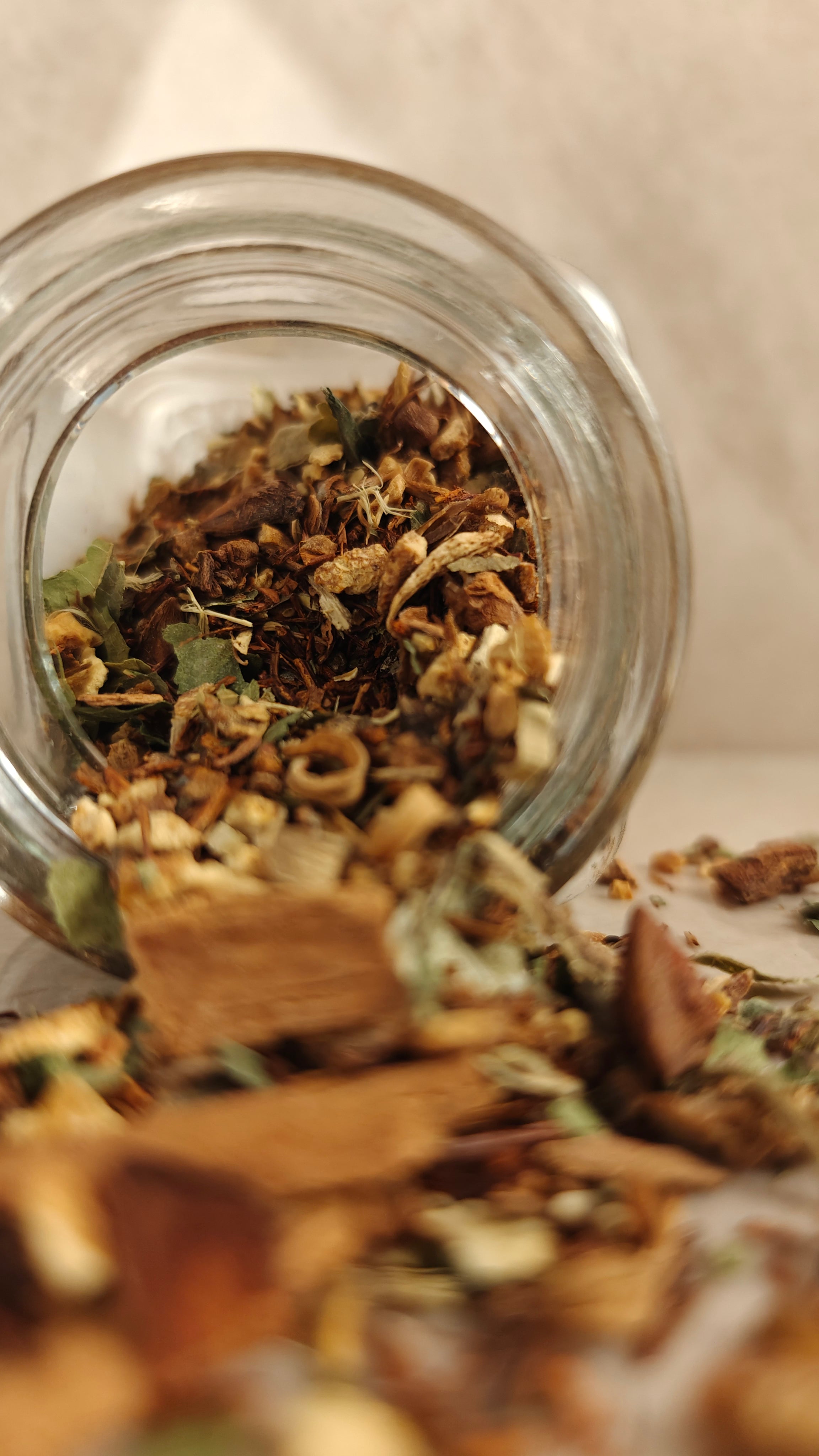 Rooibos, Cascas de Laranja, Canela, Folhas de Amora, Raiz de Alcaçuz, Anis Estrelado, Cardamomo, Cravinho, Flor de Laranjeira.
