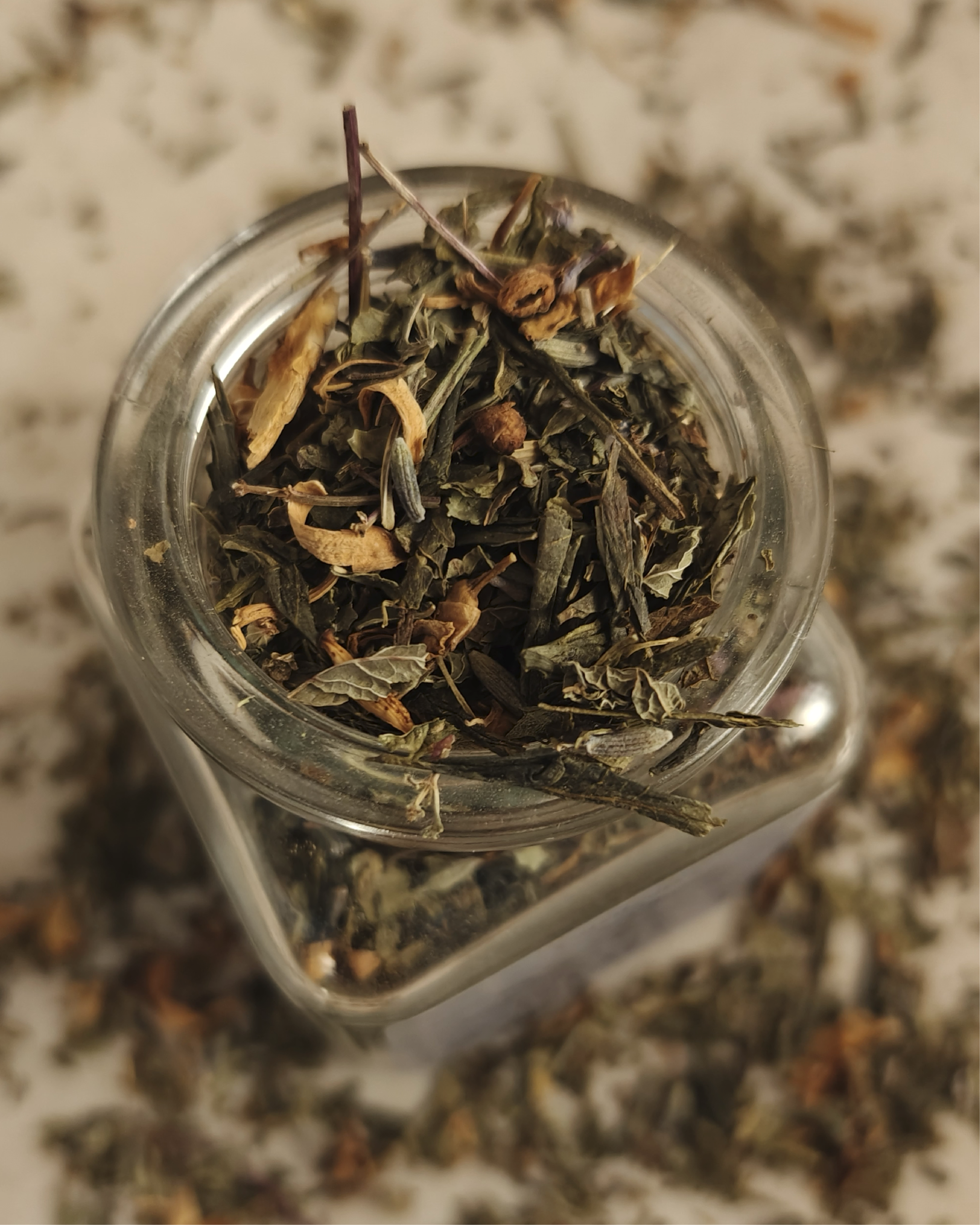 Chá verde combinado com a frescura da menta fresca, alfazema perfumada, erva-cidreira e flor de laranjeira.